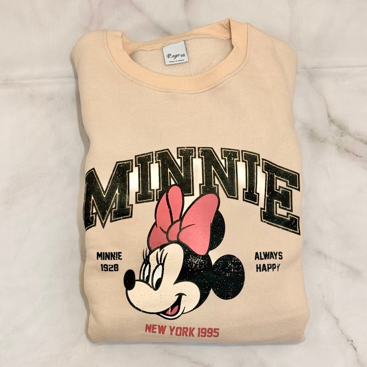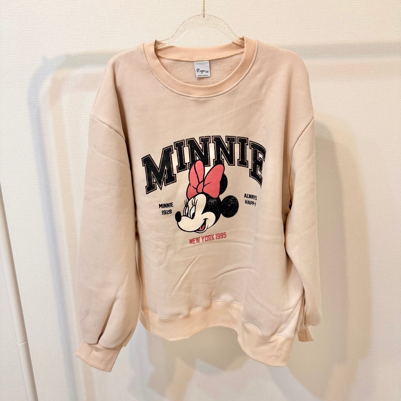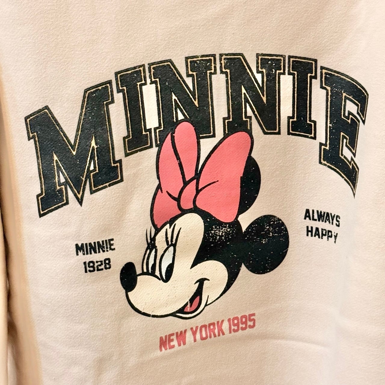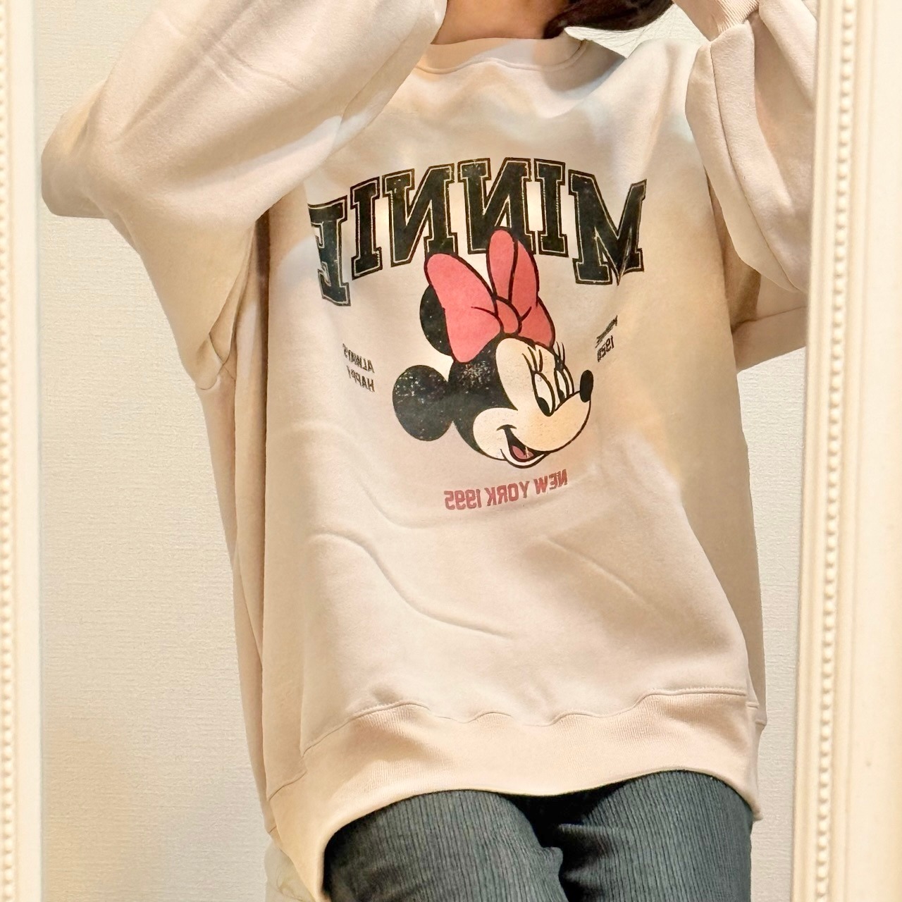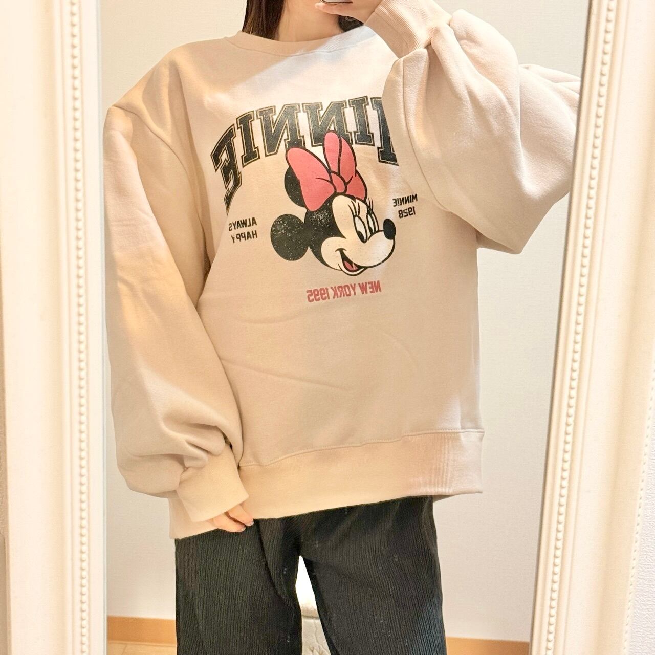 裏起毛素材で暖かいミニーちゃんが大きくデザインされたトレーナー。