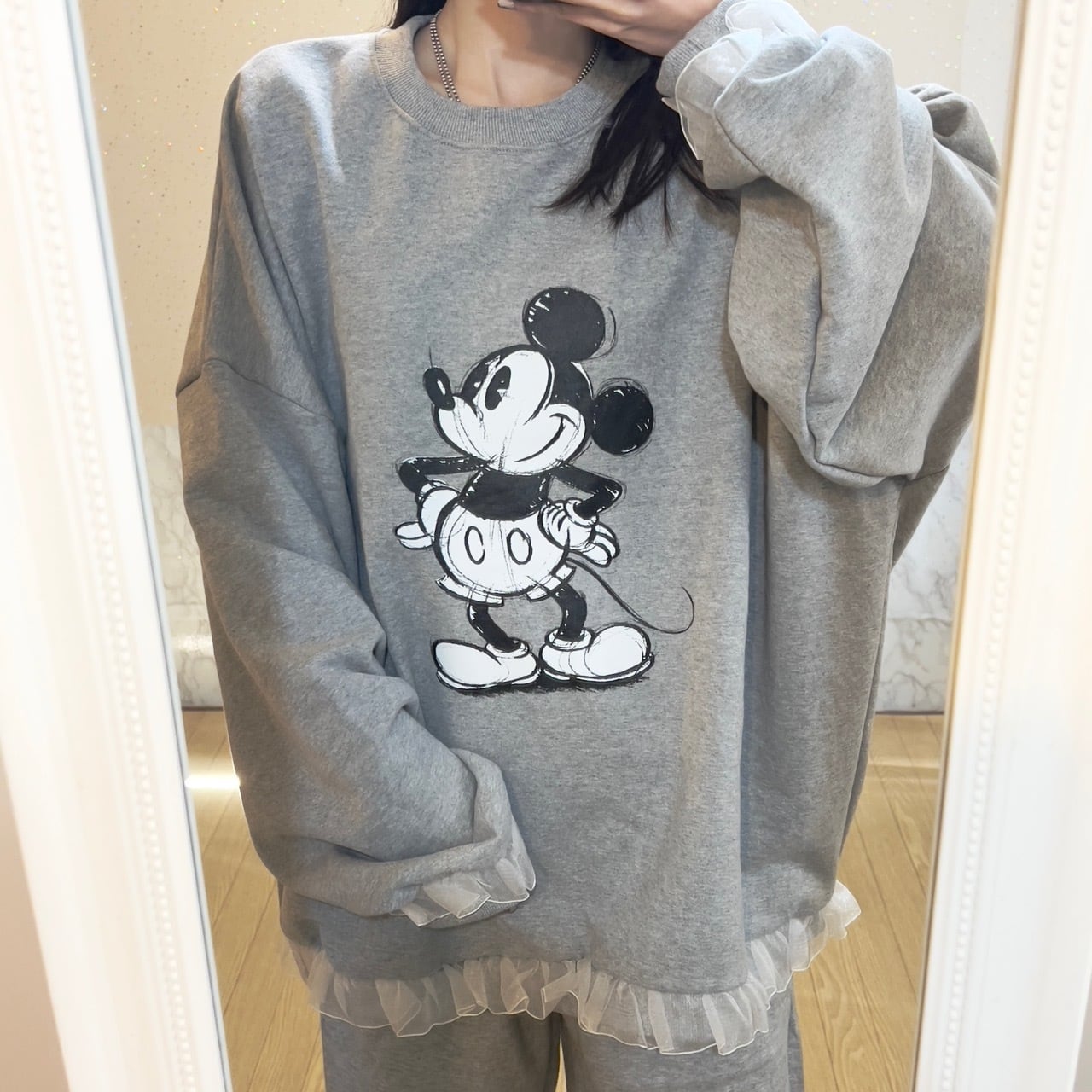 カジュアルになりがちなキャラクターアイテムをフェミニンに着れるフリルがポイントのトレーナー。
